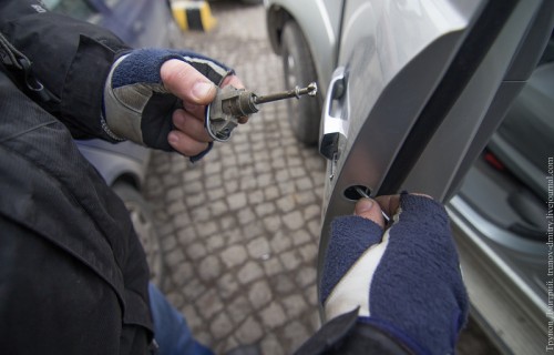 4. Дальше мастер смотрит на замок, шерудит в своем наборе инструментов и буквально за минуту вскрывает машину. Так как у меня тут не учебник для медвежатников и угонщиков, покажу только вот такую фото.