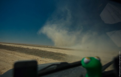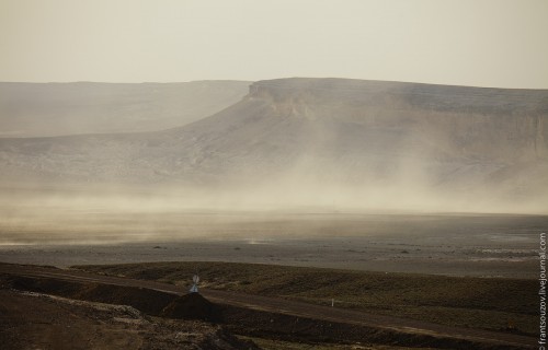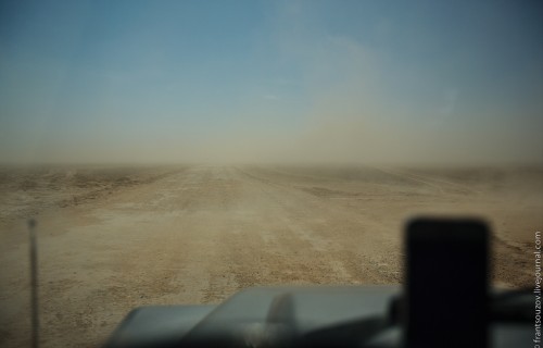 Пыль… Просто нереальное количество пыли! Песок, похожий на истолченный мел, крайне маленькие частицы которого проникают во все щели, оседают в салоне и скрипят на зубах. Мы ехали с закрытыми окнами и включенной рециркуляцией воздуха, но все равно это слабо помогало. А вот местным на древних жигулях без кондиционера приходится передвигаться с открытыми окнами, что при этом творится в салоне — я просто не представляю, но у нас все вещи были покрыты толстым слоем пыли…