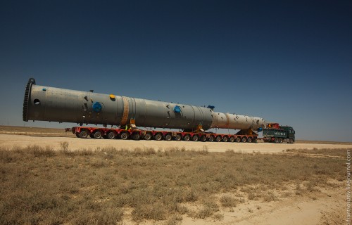 16. Вот этим ребятам было совсем печально. Тягач с машиной сопровождения впереди ехал со скоростью около 5км/ч. Скорее, не ехал, а полз, пешком было вполне реально держаться рядом с ним. Судя по оборудованию в кузове тягача, подключенного к этой здоровенной «дуре» на платформах — им по-другому просто никак. Интересно, сколько же они ехали тот участок?