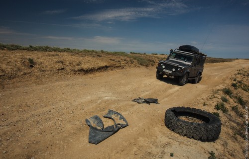 Одну гайку Юля нашла в том месте, где свернули с дороги в степь. Остальные три найти не удалось. Домкратим машину, скручиваем по одной гайке с остальных колес, чтобы закрутить это. Ну а потом две недели подряд у меня каждая остановка начиналась с того, что я обходил машину вокруг с балонником…