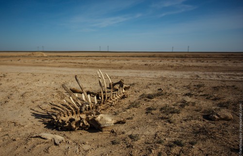 Выбрались из канавы своим ходом на глазах у дорожных рабочих, офигевших от подобного зрелища. Отделались дешево — машина цела, вещи тоже, оторвало лишь половину левого порога, но он уже и так был весь ржавый и держался на честном слове. Прикрутив его на место пластиковыми стяжками, собрались было ехать дальше, как вдруг увидели в паре метров от нашей «вынужденной остановки» этот скелет. Получается, кому-то здесь тоже не повезло.