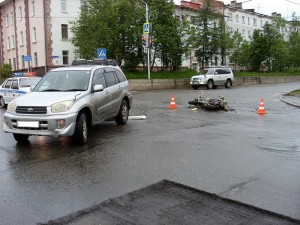 «Сегодня в 07.17 водитель мотоцикла ехал по улице Дзержинского, на перекрестке с проспектом Карла Маркса он выехал на красный сигнал светофора и столкнулся с автомобилем Toyota Rav 4, – рассказал старший инспектор ОГИБДД УМВД России по Магаданской области подполковник полиции Ян Протодьяконов, – сейчас сотрудники ГИБДД уточняют все обстоятельства произошедшего ДТП».