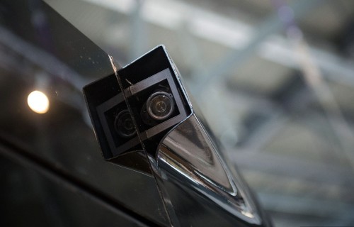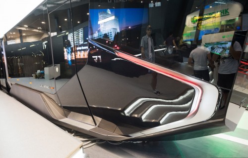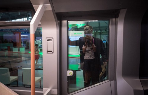 37. Вместо зеркал в трамвае камеры, которые будут выводить картинку на мониторы на лобовом стекле. Водитель трамвая сказал, что это не очень удобно, так как по плоской картинке камеры не чувствуется расстояние и нельзя менять угол обзора. Скорее всего в серийном образце сделают обычные зеркала.