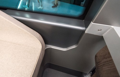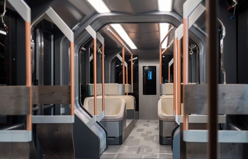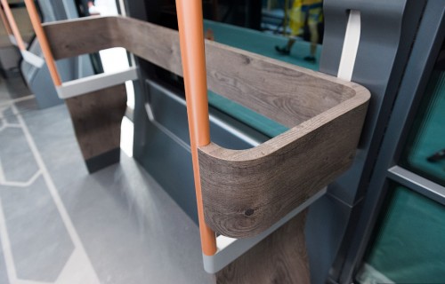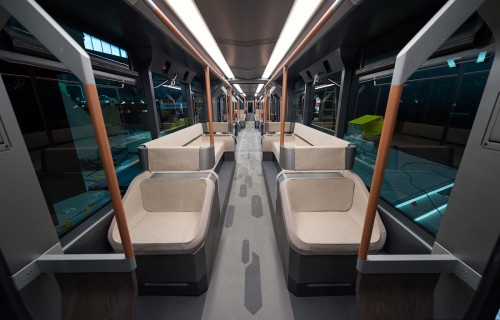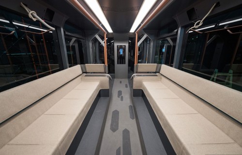 19. Сейчас отделка из ткани с каким-то войлоком. Это дорогой вариант, в зависимости от комплектации обивка диванов будет меняться. Дизайнеры пообещали, что даже в самом дешевом варианте трамвая не будет никаких ярких аляповатых принтов на ткани.