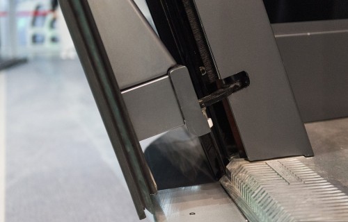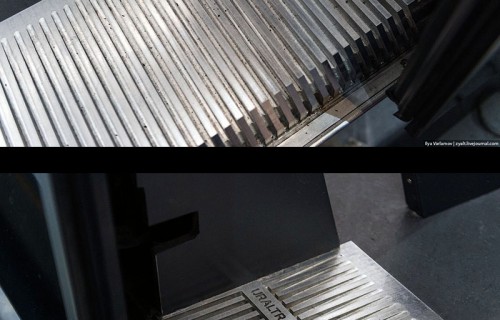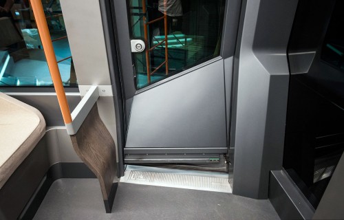 28. Подножки сделаны из перфорированного алюминия, но по секрету инженер подсказал, что планируется поставить под эту плашку рекурперативный подогрев, питаемый от тяговых двигателей в момент торможения. То есть, трамвай тормозит, электричество, вырабатываемое тягловыми двигателями в этот момент частично поступает в нагревательные элементы. Это огромный плюс, потому что в снежные зимы на подножках образуется наледь, что весьма травмоопасно.