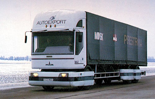 МАЗ 2000 «Перестройка» (1988) – прототип магистрального грузовика, отличавшийся оригинальной модульной конструкцией: спереди располагалась большая часть агрегатов – двигатель, коробка передач, ведущий мост и рулевое управление. При необходимости любая из «пассивных» тележек заменялась подобным набором агрегатов, позволяя строить автопоезда любой длины и грузоподъемности.