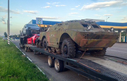 Наконец я обчистил все банкоматы сбербанка, оплатил счет, получил документы и отправился за своей покупкой. Мне предстояло не только получить БРДМ, но и еще довезти его до Москвы. Идеи доехать своим ходом развеялись практически сразу, поэтому был найден автовоз, который согласился помочь мне за 1000$. Мне действительно повезло, что водила оказался белорусом и смог беспрепятственно заехать в часть, чтобы забрать груз. Как я уже писал, мне нужно было предупредить КГБ о своем визите за две недели, чего я конечно же не сделал и вход в часть мне был закрыт. Оставалось только сидеть у КПП и делать селфи, пока военные грузили БРДМ на платформу.