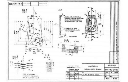 Технологически первые варианты вазовской эмблемы были довольно сложным изделием, состоящим из нескольких частей. Считается, что «каноническая» эмблема Жигулей содержит рельефную хромированную ладью, хромированную же окантовку, а также фон, покрытый рубиновым лаком, сквозь который просвечивают объемные волны, создавая эффект плывущей по воде древнерусской ладьи. Такими были эмблемы на моделях с «первой» по «третью», и такими они остались на первых «шестерках», хотя сам знак на ВАЗ-2106 стал, как мы уже знаем, прямоугольным.