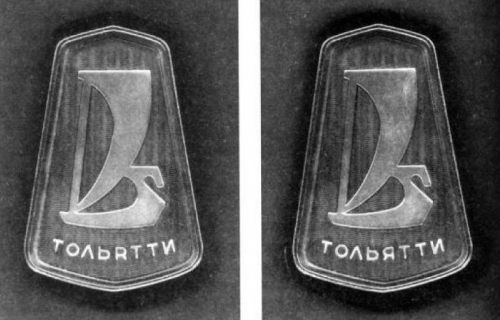 Первые эмблемы для «копеек» изготавливались в Турине по чертежам, сделанным в Тольятти. Доподлинно не известно, кто именно дополнил ладью надписью «Тольятти» в нижней части эмблемы. Одна из версий, например, утверждает, что это сделал еще Декаленков — на том самом первом эскизе на листке в клетку. Как бы то ни было, а надпись попала в окончательный (как тогда казалось) вариант, и с этой надписью произошел широко известный курьез: по какой-то невероятной причине итальянцы перепутали кириллическую Я с латинской R, и на первой пробной партии надпись читалась как «ТОЛЬRТТИ».
