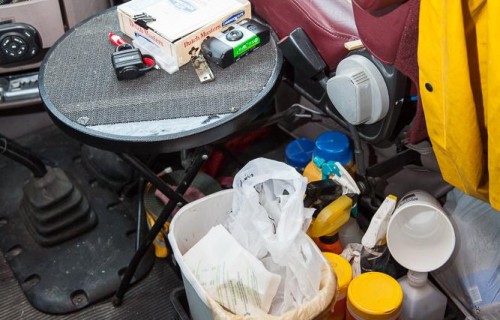 Автомобильные принадлежности, DVD-диски и стаканы с напитками… и все это в куче грязных вещей.