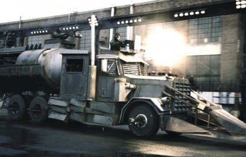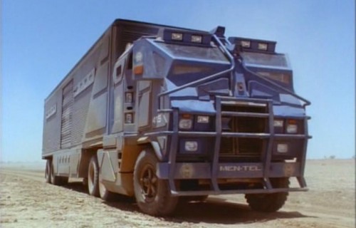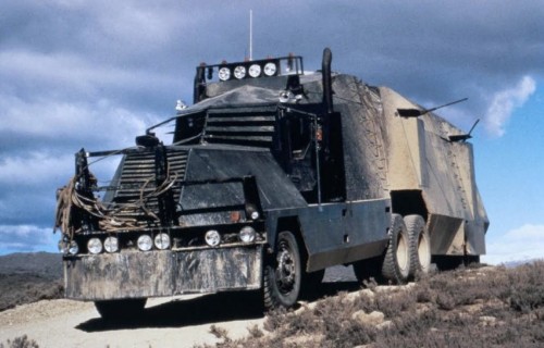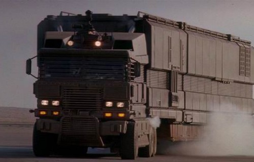 И, наконец, память детства — грузовик из фильма «Warlords of the 21st Century» (1982). На нем после «Нефтяных войн» рассекали по почти безлюдным пустошам отмороженные бандиты и грабили оставшихся в живых людишек. Звук у этого грузовика был как у истребителя, а внутри находилась куча кнопок управления и «жилой отсек». Конец этого броневичка, как вы уже догадались оказался тоже незавидным — отправился в полет с обрыва прямо как фура из «Универсального солдата».