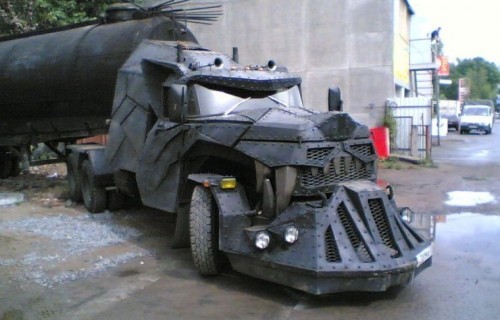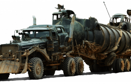 Ну куда же без боевой фуры? 2 двигателя по 1000 лошадиных сил — это вам не какая-нибудь Cкания R 730 V8. Ее экологически чистый моторчик сгодится разве что в качестве стартера для этого монстра, пожирающего горючее канистрами, бочками, лоханками и вообще всем, во что это горючее можно налить. И да, она тоже «поломалась» не без помощи скелетоподобного папуаса с серебряными зубами. Точнее — была им взорвана.