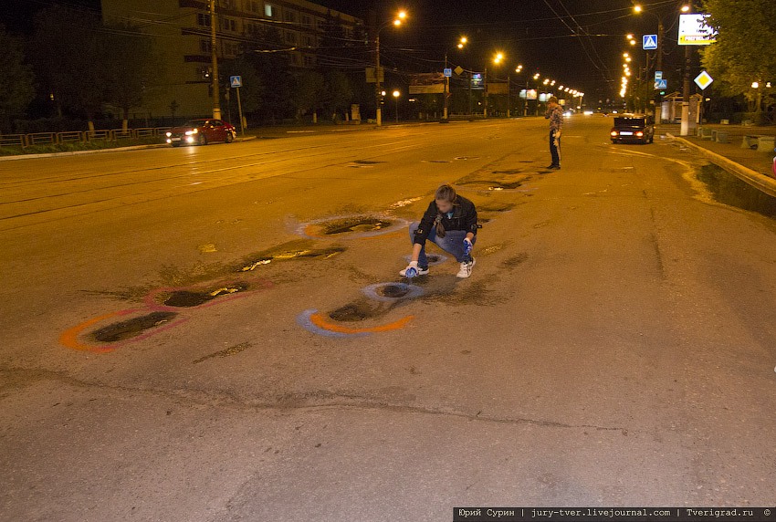Молодые люди по ночам (чтобы не мешать движению на дорогах) обводят яркими красками контуры ям, чтобы водителям было легче ориентироваться.