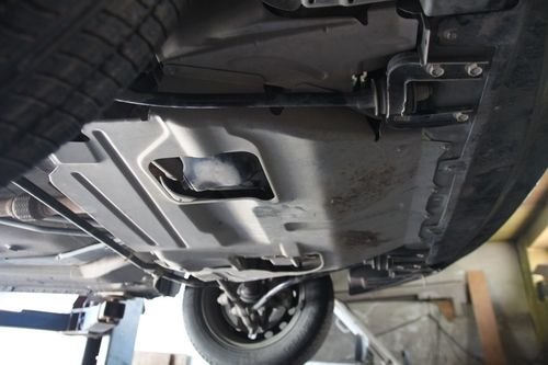 В рамках подготовки к плохим дорогам мы все же решились на установку защиты картера двигателя — слишком много рассказов о пробитых поддонах можно найти на страницах наших блогов. У дилера защиты, естественно, не оказалось. Была только для Калины, но она не совсем подходит. Мы ждали до последнего — якобы, контейнер с доп.оборудованием на Гранту уже идет во Владивосток, но увы. Поэтому пришлось обращаться в местный «джип-сервис», где за несколько часов ребята сварили нам защитную панель из 3-мм стали и придумали хитрый механизм крепежа.