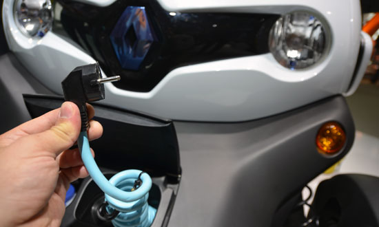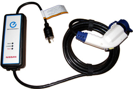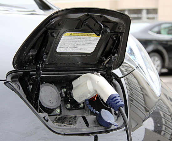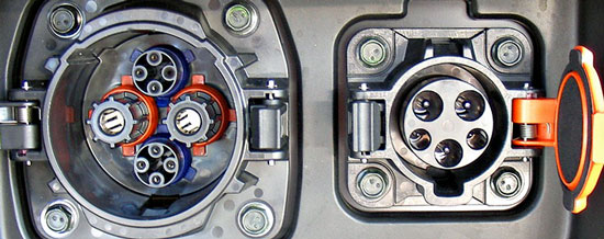 При уличной зарядке, в зависимости от типа зарядной станции, используется либо шнур с двумя пятиштырьковыми разъемами на концах, который водитель машины должен иметь при себе, либо несъёмный шнур на зарядной станции, напоминающий шланг на бензоколонке. Несъёмные шнуры и их могучие разъёмы стандарта CHAdeMO используются на мощных заправочных станциях, способных зарядить батарею менее чем за полчаса.