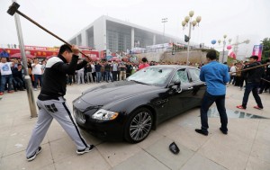 Четыре молодых человека под восторженные возгласы собравшихся разбили молотками Maserati Quattroporte у выставочного центра в городе Циндао (провинция Шаньдун) в день открытия автосалона.
