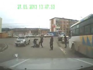 Из описания на ютубе: Товарищ переходя дорогу опрометчиво пнул проезжавшую машину. Из нее вышли разгоряченные парни и избили пешехода.