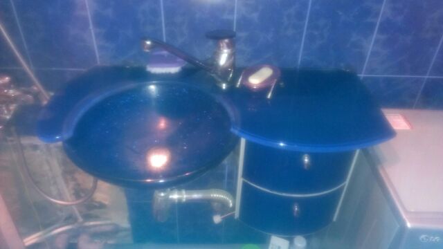 Раковина умывальник из закаленного стекла с 2-мя ящиками в хорошем состоянии. Цвет - темно-синий. Металлический сифон и держатель для раковины прилагаются.