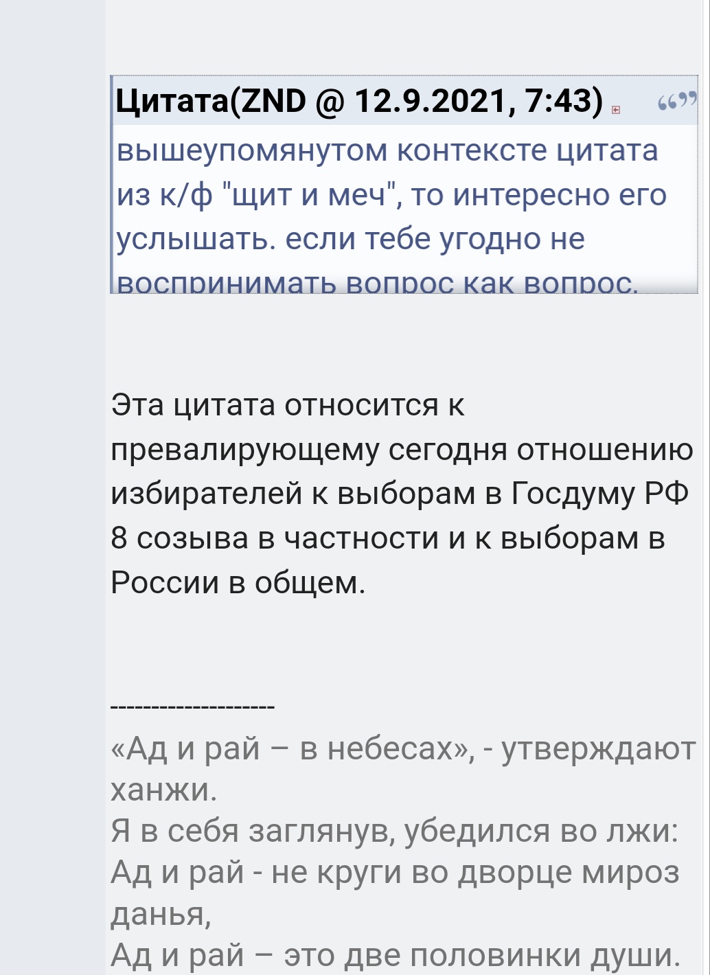 Цитата(ZND @ 10.9.2021, 17:11) ссылка доступна только зарегистрированным написано ведь: "вопрос, если угодно". "если угодно" - разумеется, тебе. и если тебе угодно посчитать мое высказывание за вопрос, а это именно вопрос, то если у тебя есть ответ - к чему относится в вышеупомянутом контексте цитата из к/ф "щит и меч", то интересно его услышать. если тебе угодно не воспринимать вопрос как вопрос, или ответа нет, то можно оставить все как есть. фуух.. вроде все подробно... Эта цитата относится к превалирующему сегодня отношению избирателей к выборам в Госдуму РФ 8 созыва в частности и к выборам в России в общем. -------------------- «Ад и рай – в небесах», - утверждают ханжи.