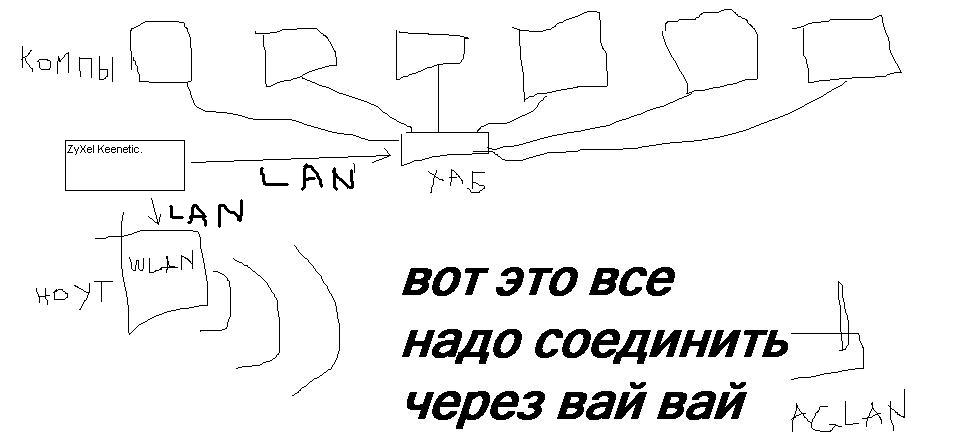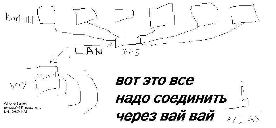 вот Пара вариантов =) №1 Роутер в режиме беспроводного моста, ловит вай-вай и раздает его по проводу на бук и компы. №2 Ноут в качестве шлюза, ловит вай-вай, раздает его по проводу. Правда потребуется устанвока Windows Server на бук. №3 Роутер в режиме беспроводного моста, ловит вай-вай и раздает его по проводу, один из компуков через USB вай-вай свисток раздает сеть на бук и другие беспроводные клиенты. №4 Роутер в режиме беспроводного моста, ловит вай-вай и раздает его по проводу на компы. Бук конектится к точке доступа к (которой конетится роутер). Доступ к общим ресурсам и управление им осуществляется штатными средствами Windows на уровне рабочей группы (доступ с логином и паролем). Для маглана это оптимально, правда за исключением случаев когда требуется общий доступ к одному интернет подключению через VPN. №5 Есть еще вариант правда на его счет я не уверен: Ноут ловил вай-вай, и егоже раздает по вай-вай которое в свою очередь ловит роутер и кормит сетью компы по проводу. Потребуется Win7 на ноуте и программа Connectify. №6 Мне кажется, что надежнее будет схема с двумя бесповодными устройствами при условии, что нужен обязательно NAT, DHCP и общее подклчюение к интернет через VPN (иначе подойдет вариант№4). Один роутер принимает сеть в режиме бесповодного моста, раздает его по LAN на компы и второй роутер (точку доступа) который в свою очередь по воздуху кормит сетью ноут и дргуие вай-вай клиенты (+ по изернету сможет кормить тойже сетью еще 4 компа). вооооооооооооооооот. =) Сообщение отредактировал God_Zilla - 19.3.2012, 16:53 -------------------- Ласковый ЗвЕрЬ!