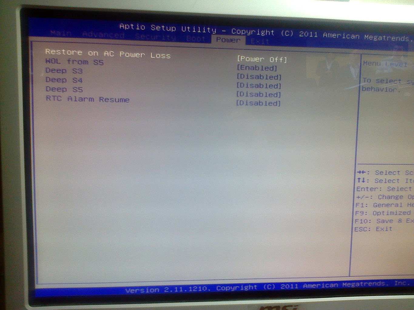 Блин, с 10 раза попал в Биос, на вкладке power все значения выключены - не понятно...