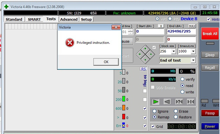 Идем во вкладку tests, выбираем read (это важно, write перезапишет весь диск нулями, чем это кончится надеюсь не надо объяснять), рядом ставим remap и пуск. чем меньше раскрашенных секторов, тем здоровее хард. В вашем случае винт не отдает смарт, попробуйте утилитой HDDScan. Либо может в биосе выключено, хотя это может не влиять ...присмотрелся... че-то паспорт не так возвращает, точно тот диск выбран? -------------------- mp3 is not a crime