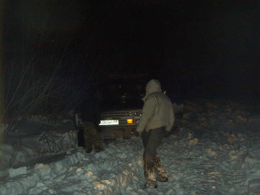 шевроле немного спустился патмо на лебедке пришлось разварачиваца и назад на неи же возращаца паджер тоже павошкался и уехал пузотекри выехали спомощью рук и лопат а по там же прямая дорога а по прямои мы лихо бежим там она прямая.. но я себе бампер умудрился помять.. когда ехал по лету.. причем ехал трезвый.. просто ехал.. вы подумйте ... что здесь вы просто ехали по ровной дорогге засыпанной снегом (вернее, токлаись).. а там будет толкать машину через валуны... %) |