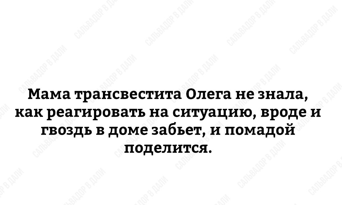 "Я ВЗЯЛ ПОЛТОРАШКУ ПИВА" НА "Я ВЗЯЛ ТРИ ПИНТЫ ПИВА" -И ВОТ ВЫ УЖЕ НЕ БУХАЮЩИЙ ГОПАРЬ, А АНГЛИЙСКИЙ ЭСТЕТ — Пришел муж пьяный, говорит жене: — - Дай попить! — Она наливает ему стакан сока. Он: — - Мне нужен свежевыжатый! — Она выливает сок на стол, вытирает его тряпкой, выжимает обратно в стакан... — - На, пей с@ка, не обляпайся... — Учительница попросила детей рассказать, кем работают их папы. Все ответы были типичными: полицейский, пожарный, продавец, сварщик, директор компании и т.д. Но один мальчик, Костя, на удивление сидел тихо, и учительница попросила его тоже рассказать, как отец зарабатывает на жизнь. — Мой папа танцует эротические танцы в гей-клубе и снимает с себя одежду перед другими мужчинами. Иногда, когда ему хорошо платят, он даже спит с ними в отелях. Учительница, чтобы отвлечь детей, быстро дала им задание, а сама отвела мальчика в сторону и спросила, правду ли он сказал. — Нет, — ответил Костя. – Он – футболист, и играет в нашей сборной, но мне было просто стыдно признаться в этом. Звонят на биржу труда из строительной конторы: — Нам нужен маляр. — Маляров нет. Есть гинеколог. — Да нам маляр нужен! — Ну, он и маляром может. Просто ему очень деньги нужны. Взяли его. Через день опять звонят: — Пришлите, пожалуйста, еще двух гинекологов. — А зачем вам еще двое? — Понимаете, вчера пришли мы на объект, а дверь закрыта. Так ваш гинеколог за два часа нам всю квартиру через замочную скважину обоями оклеил! У нас на заводе есть примета: если главный инженер кричит, значит, опять собрали не трактор. А что собрали? А что кричит, то и собрали. - СКОЛЬКО ВАМ ЛЕТ? –спрашивают женщину. - сейчас ПОДСЧИТАЮ... КОГДА Я ВЫХОДИЛА ЗАМУЖ, мне БЫЛО 20 лет, а МУЖУ 40... ,значит Я его В два раза моложе... СЕЙЧАС ЕМу 70,значит мне 35... ОБЪЯВЛЕНИЕ Женщина ищет мужчину для постоянных отношений. Коротко о себе: вкусно, молча, есть где. Шлимович учит сына Изю : - Запомни, Изя в жизни всегда есть место подвигу. И ты обязан держаться от того места как можно дальше.[/i] "Пришла в магазин з продуктами На кассе спрашиваю [i]"А картой можно?".. .-"Можно".. .Положила бубнового туза, забрала продукты и ушла -Кто нибудь может забрать ^ меня из милиции? Сообщение отредактировал lev 43 - 21.6.2017, 0:05 |