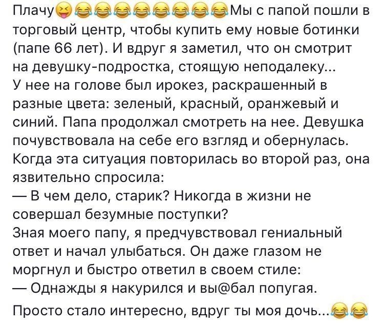 Гуляют по парку двое - он и она, обоим далеко за... Она ему говорит: - Что это Вы, Фёдор Никитич, всё молчите да молчите. Поговорили бы со мною о чём-нибудь высоком, о поэзии или о звёздах. - Да я, Анна Васильевна, человек я немногословный. Ты бы мне дала, да я б домой пошёл... В маршрутке сейчас какая-то скотина пустила новичка. Из плана: «лечь на пол и прокачать косые мышцы и пресс» Получилось только - лечь на пол. Ну, ничего, маленькие победы – тоже победы. Тощих людей легче похитить. Будь в безопасности – ешь пироги! Бесит, как люди реагируют на разницу в возрасте Сегодня я обедал со своей девушкой и люди вокруг злобно посматривали на нас, приговаривая "педофил какой-то". Даже из ресторана пришлось уйти! Хочу прояснить: моей девушке 18, а мне 31 и хоть разница в возрасте приличная, я не считаю это чем-то ужасным. Мы же все-таки любим друг друга... Полностью испортили нашу десятилетнюю годовщину! почему большинство женщин, которых бьет муж, никому не рассказывает об этом? Все просто. Первое правило Бойцовского клуба: не рассказывать о Бойцовском клубе Вас удовлетворяет ваша работа? -Ну как вам сказать, вот иду я на работу, вижу девки стоят красивые- хочется. Иду с работы- те же девки, но уже не хочется. Наверное удовлетворяет... вертолет над стойбищем в тайге .. пассажир говорит - метров на 5 зависни, я спрыгну... зависает вертолет, двери открывают - пассажир выпрыгнул, дверь сразу захлопнули, и в верх.. штурман говорит - вы че, очумели, он же просил на 5 метров зависнуть, а вы на 30 висели.. " Ага, в прошлый раз так зависли, один выпрыгнул, двое запрыгнули - узнали, что водку везем" Я прошу у вас руки вашей дочери -[i] А что у вас своей нету? - Есть, но она уже устала. [/i] Муж с женой дома занимаются сексом. Утром их сосед, старик дядя Саша, говорит: – Слушай, Николай! Вы ночью, когда сексом занимаетесь, ваши крики и стоны по всему подъезду слышны, делайте это как-нибудь потише! – А как потише? – Рот жене скотчем залепи, что ли… [i]Ночь, муж скотчем заклеивает рот жен[/i]е, и они занимаются сексом После первого оргазма муж кричит: – Дядь Саша, так хорошо? – Да! После второго оргазма: – И так хорошо? – Да! И так несколько раз. Наконец старик нервно орёт: – Коля, убери ты этот скотч со рта жены! – Почему? Потому что весь дом думает, что это ты меня е**шь! |