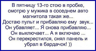 — Алло, дорогая, только что по радио передали, что один псих едет по встречке. Будь осторожнее.... - "Один????- Да их тут б....дь тысячи!!!!! Приходит муж с работы улыбается, садятся ужинать, а он хихикает. Жена спрашивает: — Ты чего такой довольный? — С работы уволили... — Что же тут веселого? — Меня уволили, а остальных посадили... Жена пишет мужу смс: - Дорогой, ты у меня лучше всех! Муж пишет в ответ: - Бухаешь или сравниваешь? - Вам не трудно сделать мне кофе с пенкой? - Да раз плюнуть! — Насть, у меня за спиной бутылка вискаря! Угадаешь, в какой руке, разопьём, не угадаешь — разобьём. — В левой? — Думай, Настя, думай! — Что такое "уйти по-русски"? — Долго прощаться, выпить всю водку, остаться ночевать. У меня в записной книжке телефона давно, не помню как, появилась странная запись под именем «Ад». Звонить туда боюсь, но иногда оттуда поздравляют с днём рождения. Чувство, когда тебя ночью обнимают и сквозь сон притягивают к себе поближе – непередаваемо. ОСОБЕННО, ЕСЛИ ЖИВЁШЬ ОДИН Слово не воробей. Вылетит- береги скворечник! Александр хотел наладить отношения с тёщей и заказать ей красивое платье, но как на зло, она проснулась, когда он её рулеткой мерил. Будущий зять приходит знакомиться. Его встречает будущая теща. теща: здравствуй, как тебя зовут? - Коля. Коля, ну что вы стоите, проходите. Наташенька сейчас подойдет. Присаживайтесь. Чего нибуть пока выпьете? Да ну что Вы. Я не пью. Теща. Дааа, Наташеньки будет скучновато с тобой. Красивая соседка стучится в дверь, открываю. - Здравствуйте, я ваша новая соседка, я хочу веселиться, пить и трахаться всю ночь! Ты свободен сегодня? - Конечно ДА! - Тогда, пожалуйста, присмотри за собакой.[/i] [i] Доктор, у меня проблема, быстро кончаю, жена недовольна. Что посоветуете? - Официальная медицина не знает средств против преждевременной эякуляции, но могу поделиться личным опытом, как делаю я... - Давайте, доктор, очень интересно! - Ну слушайте: значит, первый раз я вообще не сдерживаюсь, кончаю почти сразу... - Понятно, доктор, а второй раз? - А второй раз я уже не хочу! |