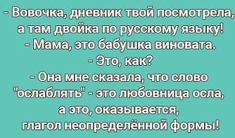 - Дорогая, прежде чем умереть я должен тебе кое в чем признаться! - Нет, милый, ничего не говори, успокойся. - Я должен покаяться... - Тебе ни в чем не надо каяться. Спи... - Нет, я должен умереть с чистой совестью! Я спал с твоей сестрой, твоей лучшей подругой, ее подругой и твоей матерью! - Я знаю, любимый. Поэтому я тебя и отравила. Она, указывая на его йенг, игриво так спрашивает: — А что это у тебя такое? Он ей, сурово так: — Кляп! -------------------- Ремонт радиостанций,усилителей,сабвуферов 89246918246