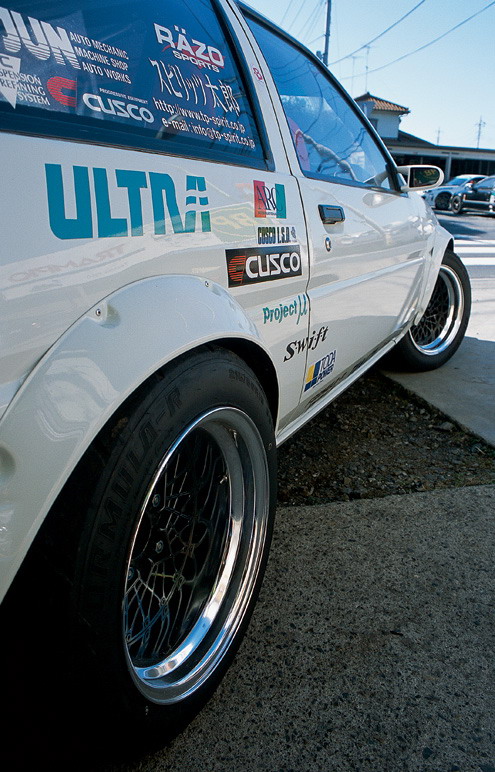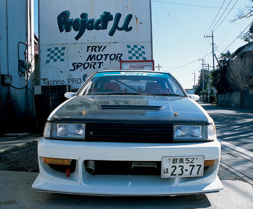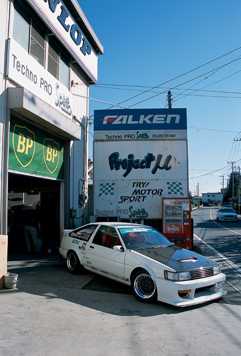Перевод: Drom.ru Автор: Jonathan Wong Фотограф: Jonathan Wong при перепечатке ссылка на источники текста и перевода обязательна! Одна из лучших в Токио гоночных Тойот обнаружена в гараже Techno Pro Spirit Катаясь по улицам Токио, я понял, что не слишком хорошо ориентируюсь на местности и толком не знаю, где и как лучше срезать. При этом в Лос-Анджелесе я могу добраться в любой район города раньше друзей и вообще карту города я знаю лучше, чем картографическая система MapQuest. В Японии же все иначе – Токио состоит из множества маленьких улочек и закоулков, и нужно потратить несколько лет жизни, чтобы научиться в них ориентироваться. Вот почему меня изумила способность моего друга (и гида) Тэцуя перемещаться по этим улочкам на автомобиле так свободно и непринужденно. Еще больше меня шокировало то, что Тэцуя с легкостью нашел дорогу в тюнинг-мастерскую Techno Pro Spirit, хотя ни разу там не был. "No problem," говорит он, и мы выходим из машины. Мастерская расположилась на небольшом участке дороги в сельской местности – вокруг одни фермы – трудно представить, что кому-то захочется заниматься тюнингом своего авто именно здесь. Но с другой стороны, лучше места и не придумаешь – ведь здесь нет риска разбудить адским шумом соседей. В Techno Pro Spirit готовы исполнить все желания клиента по созданию машины мечты, и, судя по богатому ассорти автомобилей, принадлежащих хозяину мастерской Тосио Кумакура (Toshio Kumakura), он несомненно готов работать со всем, что имеет четыре колеса и мотор. Итак, начнем с AE86 Levin. Этот автомобиль – один из лучших в коллекции Кумакура-сана. Машина тихо стоит в гараже, но стоит механику сесть внутрь и завести ее, как все вокруг наполняется бешеным ревом. Машина просто поразительна. Вообще, целью создания этого авто была разработка новой продукции линии Spirit. Загляните под ее карбоновый капот Goodline и поймете почему. От заводского мотора практически ничего не осталось, а впускной коллектор Toda Racing на головке блока цилиндров явно свидетельствует о фантастической мощи. Блок получил второе дыхание благодаря кованым поршням и шатунам Toda, а также коленвалу от AE101 ('91-'95 Levin). Головку оснастили парой распредвалов Toda Racing (впуск: 304 градуса, выпуск: 300 градусов), а между головкой и блоком поставили металлическую прокладку TRD. У машины довольно сложная топливная система: инжекторы производительностью 534cc каждый были взяты от Lancer Evo III и модифицированы специально для этого мотора; также были использованы некоторые детали от AE101, а именно топливный и масляный насос. В итоге, максимальная мощность авто составляет 204 л.с. при 8730 об./мин., а максимальный крутящий момент 137,37 Нм при 6400 об./мин. Поскольку автомобиль часто используется в дрифте, команда Techno Spirit сочла необходимым укомплектовать трансмиссию two-way LSD от компании TRD и изменить передаточное число на 4,5. Помимо этого, были установлены крепления рычагов задних тяг Revolver. Еще один интересный компонент этой машины – ее система охлаждения: были установлены радиатор и вентилятор Spirit, а также масляный радиатор Trust. Кумакура-сан не преминул заменить и подвеску. Передние пружины теперь от Swift, задние – от TRD, а регулируемые амортизаторы - от Spirit. Шасси у автомобиля довольно низкое, и кузов почти лежит на асфальте, поэтому неудивительно, что автомобиль достаточно сложно погрузить на трейлер, не поцарапав при этом днище. Задний мост сделали полностью р