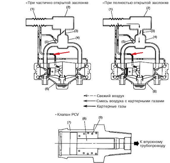 mey,Нашёл картинку из мануала, демонстрирующую как идёт поток воздуха и картерных газов при разном положении дросселя