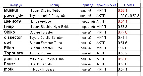 АЕ-95 у него, вот без заявки ни шагу теперь и чё мене не правильно мой результат сказали? вы ж таймер не сбросили, последние замеры сохранились (мои как раз): 1 круг - 01:01.8, 2 круг - 00:58.6, 3-й - 00:58.1, 4-й - 00:56.6 Сообщение отредактировал Торонага - 18.2.2013, 14:25 |