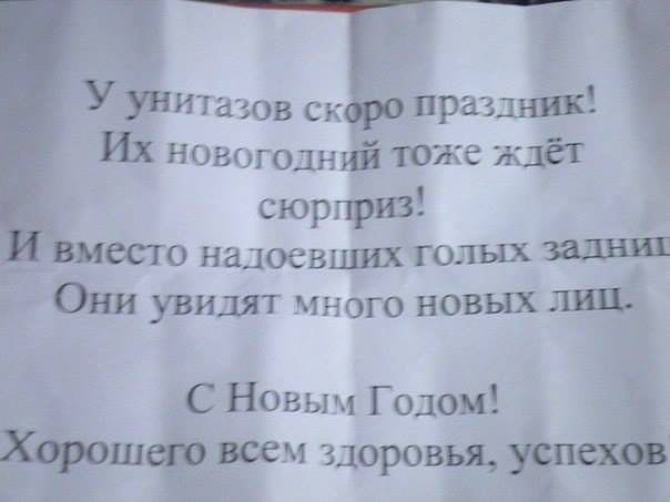 В новый год за окном тихо падает снег Пусть за вашим столом будет радость и смех, Пусть завидный успех ждет вас в деле любом И войдет без помех счастье в светлый ваш дом! Всем по новой машине в Новом году, а пешеходам по бесплатному такси! Денег побольше! Семейного тепла, любви близких людей и вообще - побольше любви и добра вокруг! Здоровья покрепче! Жизни поярче! Сюрпризов от деда Мороза приятных ПОБОЛЬШЕ! -------------------- Секрет долголетия: ешьте больше фруктов, и меньше друг друга.