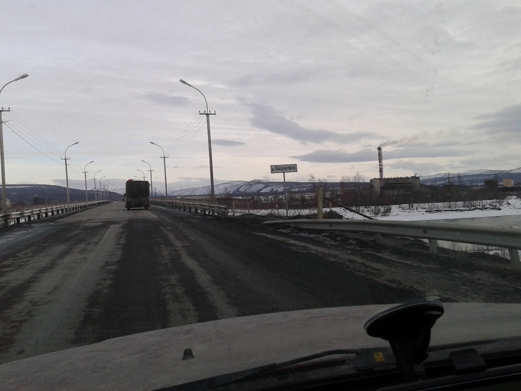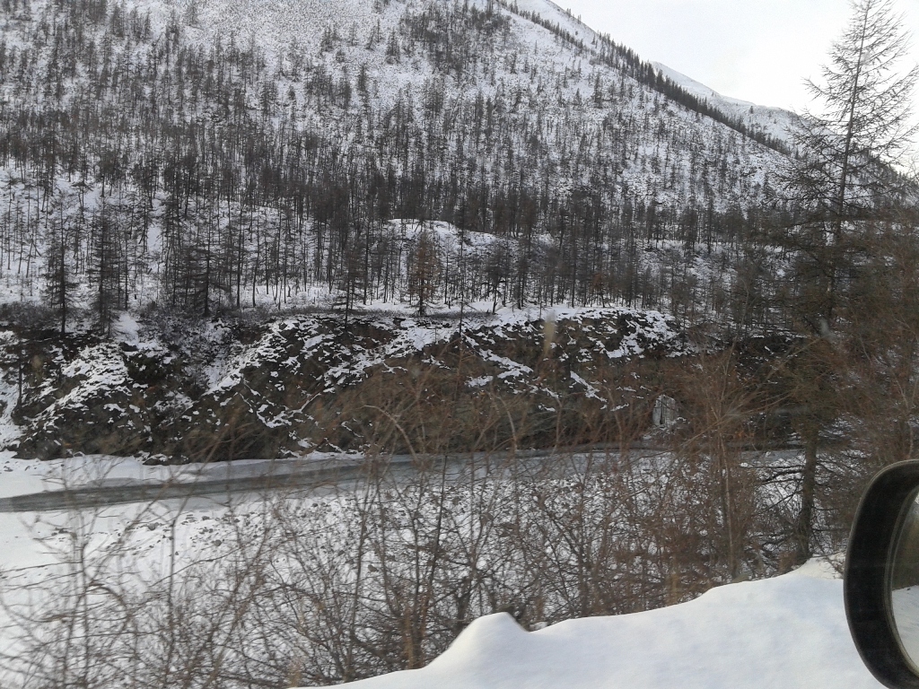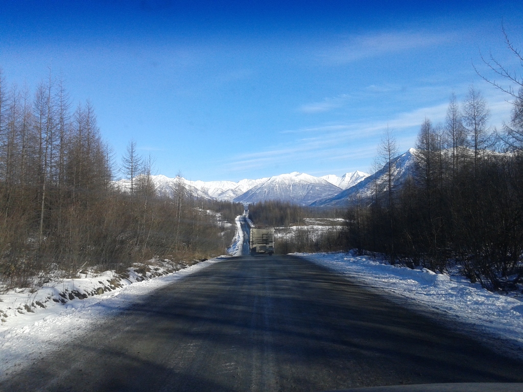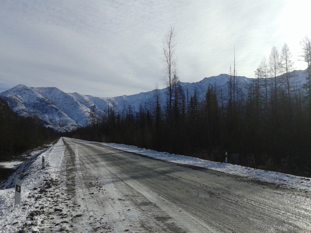 Кстати вот так было по погоде в итык кюеле Добравшись до Тёплого ключа,заехали на заправку,да и вообще остановились попинать по колёсам да с морозцем.Самое интересное что в хандыге было -8,а в тёплом ключе весна +1 и дорога начала местами таять,но правда ненадолго,буквально 30 км от посёлка всё встало на свои места -8 -10 Впереди были видны горы и мне почему-то стало очень комфортно и спокойно на душе. Перевалив Томпорукский перевал едем дальше,я залипая в окошко на горы,два раза чуть не ушёл в кювет,друг смотря по сторонам чуть не воткнулся в отбойник...про*бал поворот )) Короче так и ехали дальше смотря по сторонам,любуясь величеством гор.Я не был на кавказе,говорят там горы гораздо круче,но пока что для меня именно этот отрезок очень хорош.Когда едешь по распадку меж этих гигантов понимаешь какая ты песчинка на фоне природы и насколько незначительны наши проблеммы,заботы.... Летом надо будет в ту сторону сгонять ,найти площадку удобную для лагеря,поставить кресло,налить себе чайку в кружечку и откинувшись релаксировать и созерцать величие природы,а мысли о вечном сами придут. Заехали на родничёк,набрали чистейшей водички для чаев и дошираков Дальше пошли "прижимы",скажем прямо:от былого там уже ничего не осталось,просто нормальная грунтовая дорога.Насыпь местами метров по 50 над всем остальным,короче едешь и не паришься. Наконец то пустили мост над ущёльем в конце прижимов! правда фоток этого места нету ибо сделали дорожники очень лютую петлю и скользко было очень,не до фотика.Я честно говоря ждал больше всего впереди ворота и заячью петлю,там больно подъём знатный и если будет лёд под колёсами-жопа одним словом накроет всё это шествие,ибо дуката на переднем приводе в мегагору по льду откажется ехать 100%. Перед петлёй остановились пропускать грузовиков которые ехали нам на встречу.Самое приятное что именно там водители очень культурны и предупреждают об опасностях и кол-ве машин которые едут за ним.Уважение этим хорошим людям! Когда ребята на замыкающей машинке спустились мимо нас,водитель дал отмашку,мол давай! Ну я и дал, попытался разогнаться перед подъёмом,чтоб хоть сколько нибудь пройти по льду на инерции...какого же было моё разочарование,за поворотом добрые дорожники засыпали подъём с поворотами толстым слом шлака и дукато спокойненько на третьей заполз на перевал.Правда дальнейшие бугры не были такими прикольно посыпанными и напоминали местами каток,но там более прямо и не так опасно,короче едем дальше. Подъехав к одному из спусков многочисленных бугров после петли упёрлись в пробку Практически без проблем добрались до Кубумэ,практически это потому что в одном месте,на повороте,мою сараюшку закусило в бровку и я со страху аж на сиденье приподнялся...адреналин полез В кубе посетили столовку-кафешку,радости Костяна не было предела:В Якутии,пожрать и не готовить самому?! ура! )) Поели,взяли в дорогу пирожков всяких и много,правда цены уже дали понять что едем домой.Главное что взяли пирожков с грибами,мне их расхваливали,а я не пробовал.Сейчас знаю что пирожки вкусные.Ещё район кубы порадовал тем что за бортом -14 -16 и в кабине дукато стало прохладно,это придало энтузиазма в покорении километров дороги до Ольчанского перевала. К Ольчанскому подъехали уже давно затемно и зузман давал о себе знать.С мыслью о подъёме,нагрузке на мо