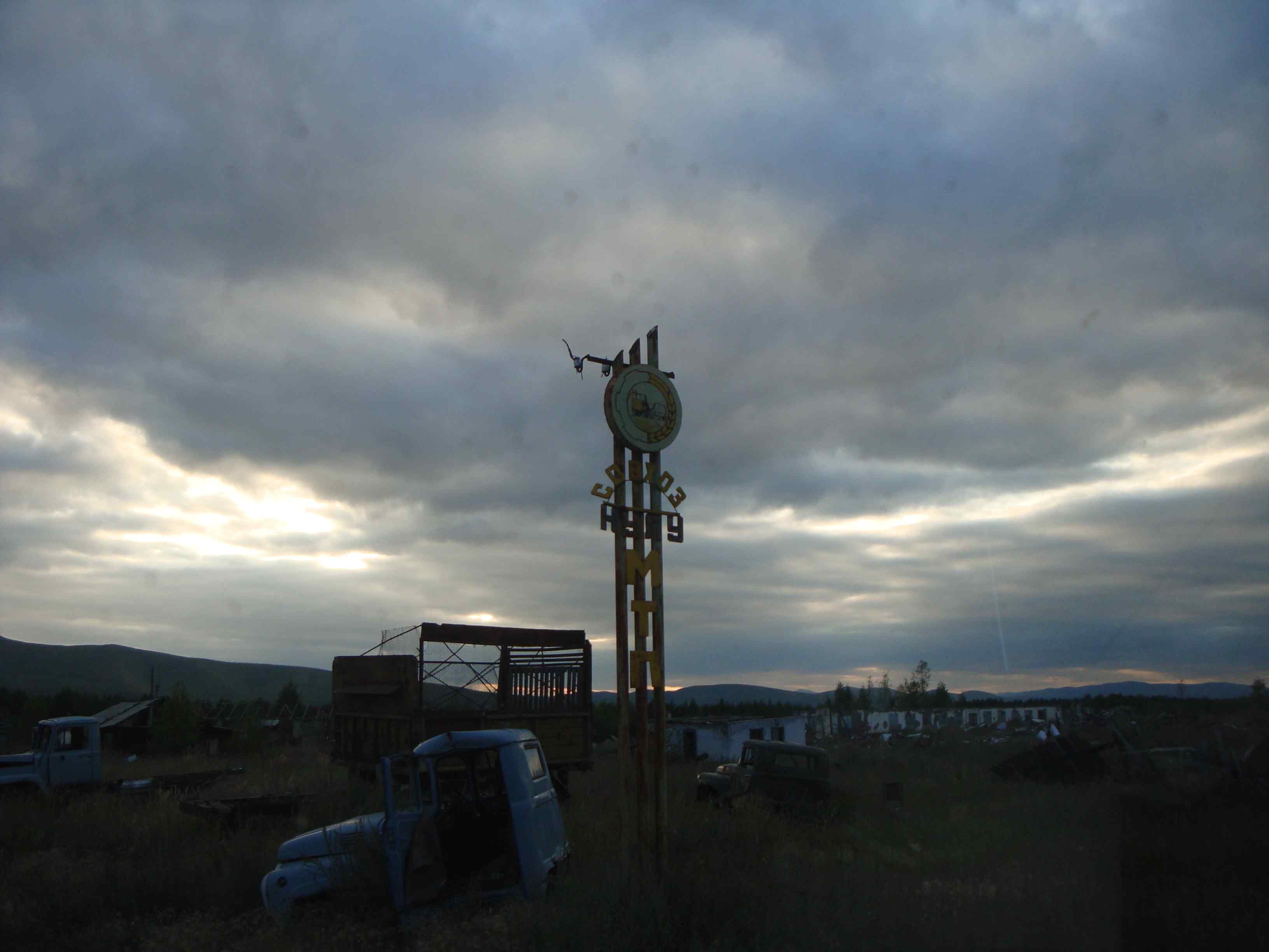 Время около 21. Поехали искать новый плес. У поворота на метостанцию ушли мимо гаражей по дороге, судя по карте, где Эмтыгей впадает в Аян-Юрях. В одном гараже то ли сарае топилась печка, сидел человек, охраняющий их (на вид лет 40-45).Проехали с км-полтора и уперлись в переезд через Эмтыгей. Мост разрушен, ехать только вброд.