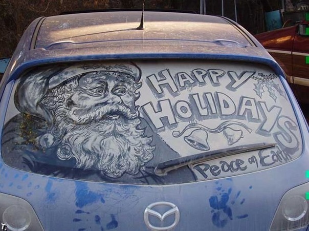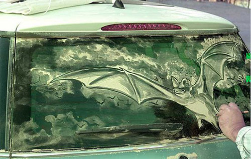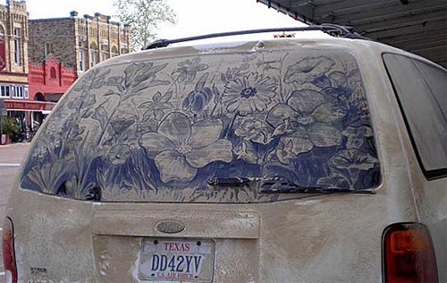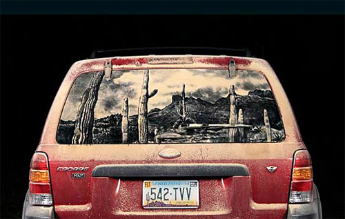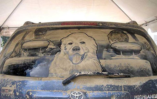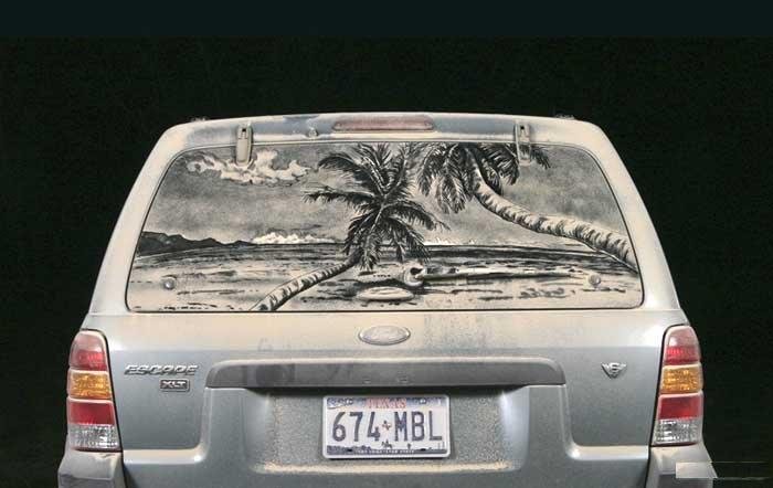 Креативный подход! вот только как же потом ездить с такой "аэрографией" не помыть, в дождь не выйхать, да и новый слой свежей пыли явно не улучшит вид!
