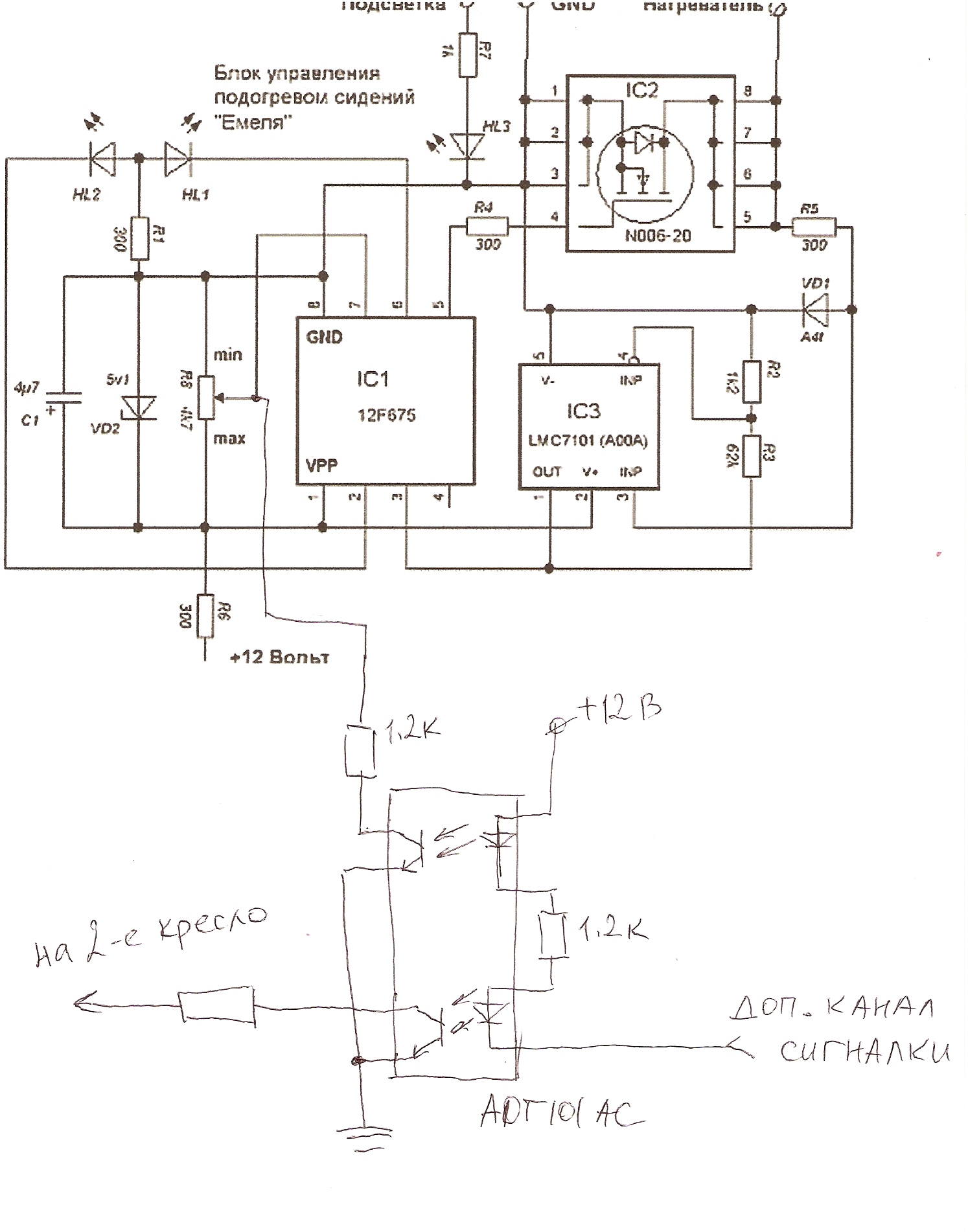 Наверно надо добавить для желающих повторить это: если управлять только одним сиденьем, то можно подключить контакт доп. канала к средней точке регулятора только через резистор 1,2 К, т.е все, что нарисовано не потребуется, только один резистор. А проблема будет только подключиться к разъему на сигналке. То что у меня не было там контакта, это мне повезло. На другой машине при установке сигналки провод был откушен от разъема, так вот контакт вытащить пока не удалось - разъем не повернуть, т.к. провода сильно натянуты, подлезть можно только одной рукой.