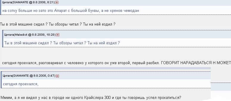 Цитата(Maledict @ 11.8.2008, 10:45) ссылка доступна только зарегистрированным DIAMANTE Как можно сравнивать две несравнимые вещи? Крайслер тот наверное тоже в чем-то хорош, но он то не позиционируется как машина для молодежи, блин. Ну как можно отвертку с шурупом сравнить? Они же находятся в разных сферах по функционалу! И то...если б мне нужен был бизнес авто - я бы не на крайслер смотрел, а на Легенду или Инспайер, но никак не на Крайслер =) А это уже совсем другая история. Согласен только с одним - ценник кусается. так я же инаписал в начале что "наверноее это будет не в тему" и сравнивал не машины, а ценник,исходя из личного субъективного мнения что Я! бы лучше купил за ти деньги. Но как просто про машину, я не говорил вот .... элемент гавно а крайслер рулит, хотя наверноее и мог дать повод так подумать словами "хренов чемодан" .....Легенду или Инспайер, но никак не на Крайслер =). мне тоже безумно нравится эти машины, но ...... запал он мне))))) Ну а вообще BMW 7 моя любовь) поэтому и езжю на диаманте...... но дорогая она зараза 2001 год 136000 пробега - 1700000 - я офигел но одно однозначно и точно ТОЛЬКО НЕ ТОЙОТА!!!!!!!!!!!!!!!!!!!!!! Сообщение отредактировал DIAMANTE - 11.8.2008, 22:52 |