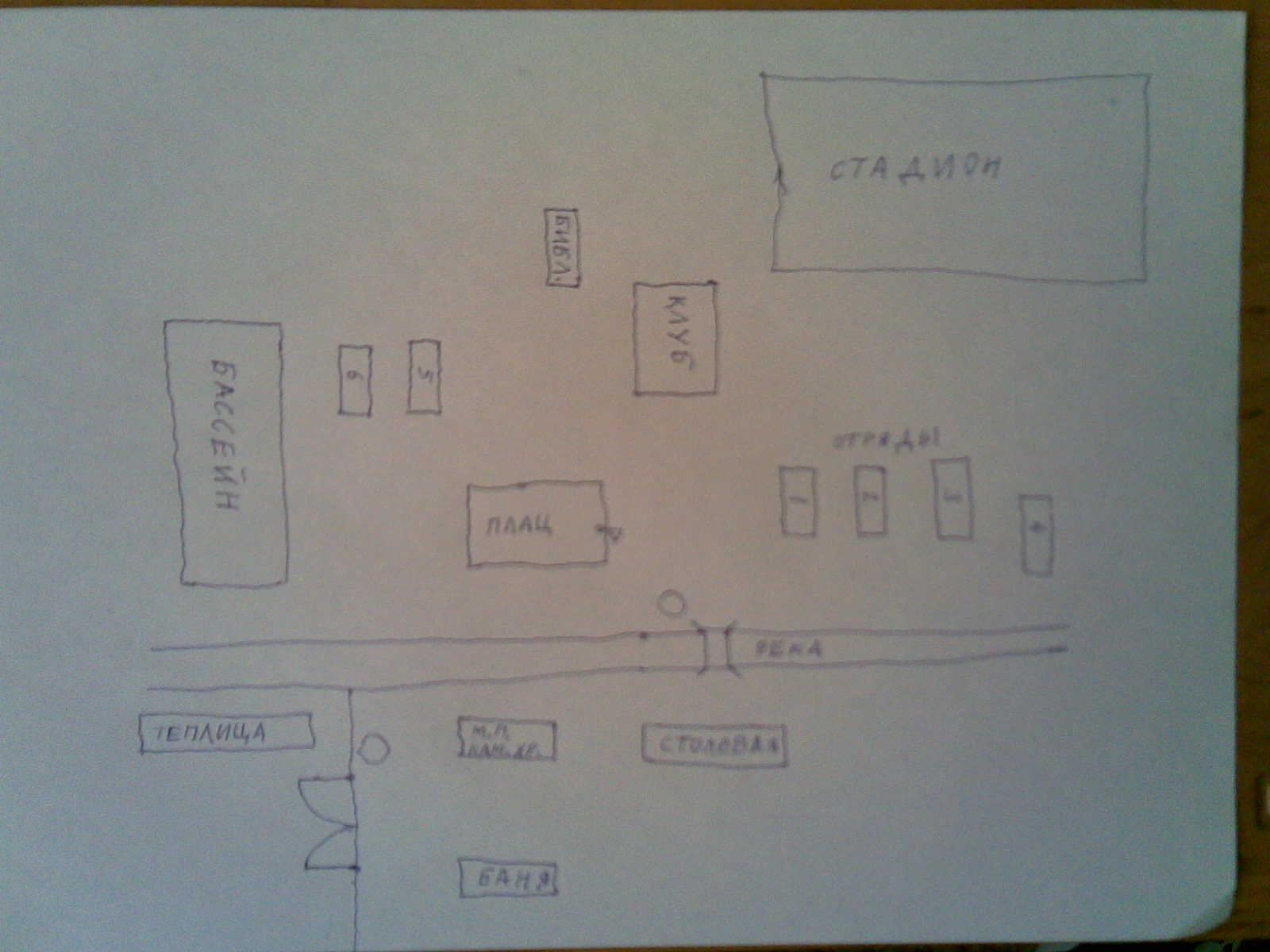 2 Олег 1, схемку набросал. Цифрами номера отрядов обозначены. У ворот кружок - беседка для гостей. У моста кружок - лавочка с крышей. Напротив бани медпункт с камерой хранения. Остальное вроде различимо. Расположение домиков персонала и складов не помню, поэтому не показал. Между бассейном и теплицей трубы через речку были. По ним из лагеря уходили. Наверно и ты по ним в Юбилейный уходил