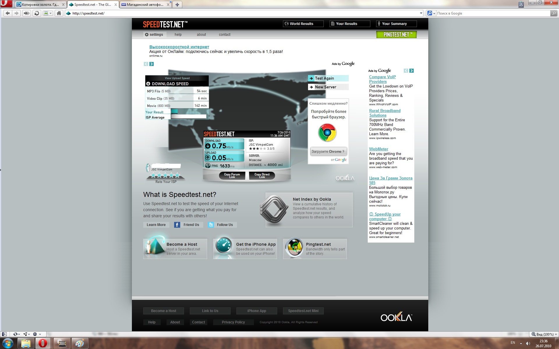 Цитата(S17 @ 1.7.2010, 8:41) ссылка доступна только зарегистрированным К сожалению модемчик уже отдал. Но по внутреннему трафикомеру - среднее 210 кбит/сек входящее. Пик был 315 кбит/сек. Днем бывали провалы до 40 кбит/сек. О цене я выше указал, что не знаю. Сообщение отредактировал Аццкий - 1.7.2010, 10:00 |