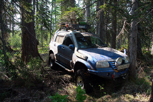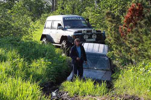 В прошлые попытки покорения Ныврово первая речка проблем не доставляла, но зима 2009-2010 года на Сахалине была супер-снежная, а весна поздняя. Если на юге реки уже сошли, то на севере половодье было в самом разгаре. Переправа будет либо очень веселой, либо плачевной — подумал я и вырубился. Утром быстро позавтракали, кто кашей, кто армейским пайком и пошли осматривать речку. Вода быстро спадала, по разным оценкам за ночь уровень воды понизился на 5-15 сантиметров, хотя принципиальной разницы это не создавало. Побродив вдоль речки, лучше брода мы не нашли. Одно радовало, выезд с той стороны был пологий, значит, шансы застрять в речке и полностью вымокнуть были уже меньше. Естественно, первой в речку пошла Годзилла. Тогда мы были уверены, что 4 тонны — не плавают. Съезд в реку с нашей стороны представлял собой отвесную стенку, поэтому вход машины в реку выглядел как последняя секунда жизни подбитого бомбардировщика или как первая секунда жизни новой подводной лодки. Однако у всех были шноркели, и скрывшийся под водой капот, может и выглядел страшно, но особого беспокойства у опытных джиперов не вызывал. Тем более Годзилла была дизельной. Речка оказалась не такой уж страшной. Нырнув в самом начале, дальше Годзилла прошла без проблем. Настала очередь нырять Эскудикам. Как-то у меня спросили — зачем бензиновой машине шноркель, ведь бензинка все равно в воде заглохнет. Нифига. Может Чайзер какой и заглохнет, а вот сузуковские двигатели без проблем работают под водой. Хоть и бензиновые. Ведь Эскудо, как и Джимни, начались с японских военных джипов. Поэтому гидроизоляция осталась на уровне. Сузуковские капоты ушли под воду еще глубже… однако двигателя даже не чихнули. Ни в этот раз, ни в следующие. Тем не менее, течение было насколько сильное, что машины поплыли. Но Годзилла страховала стоя на том берегу и вытягивала поплывшие по течению Эскудики на раз-два-три. Тоже самое было сделано и с Лендом. Через пол-часа после завтрака все машины были на том берегу. Первая речка далась относительно легко. В этот и следующие два дня дорога была достаточно однообразна в одном — с утра до вечера напряженный труд пилотов и штурманов, работа машины и всех ее агрегатов на пределе возможностей. Даже кое-какой пластик под капотом расплавился и деформировался. С утра до вечера четыре машины одна за одной пробивались сквозь таежный лес по поймам ручьев к большой мари залива Куэгда, откуда до Ныврово было уже рукой подать. Местами шли по старому ГТТэшному следу, местами съезжали на объезды, уже заваленные упавшими за два года деревьями. Местами пропиливали новые объезды. Три машины — Годзилла и Эскудики шли с примерно одинаковой средней скоростью. Годзилла шла лучше по болотам за счет меньшего давления на грунт. Зато Эскудики отдыхали на объездах за счет меньших габаритов и лучшей маневренности. Честно говоря, я до сих пор удивляюсь, как четырехтонный Сафарь на 44 колесах умудрялся протискиваться между некоторых деревьев… Эскудо тоже радовал. Хотя, в болотистой местности Эскудики застревали в разы чаще, чем Годзилла, но мощные лебедки (9000 / 9500) выдергивали полуторатонные машины из грязи как пробку из бутылки. Передние лебедки были обслуженные и доработанные, поэтому поломок не было, несмотря на жесткий режим работы. Здесь впервые за все покатушки нам пригодились зад