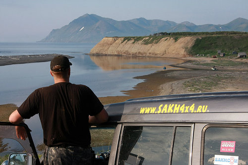 Находясь в легком адреналинистом шоке после заплыва по речке Валовской, остаток пути до домиков Ныврово (еще полдня) я помню не так хорошо. Дорога местами шла по болотистому берегу залива Куэгда, местами проще было ехать прямо по заливу, уходя на 30-40 метров от берега. Глубина была там небольшая — от 40 до 60 сантиметров, течения не было, поэтому в этот раз мы ехали в воде, а не плыли в ней. Несколько раз машины застревали в вязком дне, но каждый раз выбирались сами. Правда, для этого Эскудикам приходилось давать газу, поднимая большую муть и выбрасывая ее сразу тремя (по количеству постоянно вращающихся колес) фонтанами в небо. Экипаж МКС наверное глядел на это безобразие из космоса и думал… да, а на Сахалине весна, вон слониха с двумя слониками в заливе плещется… Как только мы вышли ближе к заливу, сразу стало попадаться огромное количество белоплечих орланов. Если на юге Сахалина это редкая птица и не подпускает к себе близко человека, то непуганые орланы залива Куэгда по поведению больше походили на городских ворон. Смотрели на нас, рассиживаясь на верхушках соседних деревьев и даже не думали улетать. Подпускали к себе на 30-50 метров. Я знаю, это просто мечта любого фотографа — иметь возможность так близко снимать этих сильных и красивых птиц. Трижды мы встречали их огромные гнезда вдоль нашего маршрута. Наверное, в гнездах были их птенцы, с земли не видно. Гнезда действительно большие, как мне рассказывали, если с гнездом что-то происходит, и нужно строить новое, то на следующий год орланы не заводят птенцов, весь год тратят на постройку нового гнезда. Одного, молодого орлана мы встретили прямо на берегу залива. Некрасивый самолет не летает, а орлан не летает, если он мокрый. Орланы питаются рыбой, падая с высоты и хватая ее с поверхности воды. У молодых орланов это плохо получается, и они часто намачивают крылья и не могут летать, пока не высохнут. Вот такого мокрого орлана мы встретили на пути, сфотографировались с ним, но трогать не стали. Уж больно он задирал крылья и при попытке приблизиться норовил тяпнуть за руку острым клювом. Проехав несколько километров по заливу, мы вплотную приблизились к той точке, пребывание в которой делает вас полноправным членом клуба «Ныврово». Осталось лишь перевалить сопку (когда-то на ее вершине располагалась точка военных связистов) и переплыть еще одну речку — уже в самом «поселке». Что и было успешно сделано в течение часа. Правда, дорога представляла собой заросшую тропинку, где и человек трудно пройти, не повредив глаз… Мы ехали там на машинах, задраив окна и раздвигая стену из веток и деревьев кузовами. Ну, вот он, клуб «Ныврово»! Бампер-контроль пройден! Около домиков нас не хлеб-солью, но яйцами и икрой встречали наши ЛендКрузеристы, на время превратившиеся в ВотерКрузеристов. Пока мы боролись с остатками пути, они дошли по заливу до Ныврово (кое-где волоком протаскивая лодку по мелководью), посетили стоящую неподалеку самую северную сахалинскую метеостанцию и, радушно принятые метеорологом Алексеем, привезли в Ныврово яиц, икры, рыбы и черемши. Через пять минут после торжественной фотографии встречи на Ныврово, поднос был почти пуст, а желудки соответственно набиты. Отгадайте загадку — волосатый, питается рыбой, икрой, яйцами и травой, но не медведь? Правильно — джипер! Теперь у нас было неско
