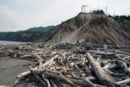 Один из дней отдыха был полностью посвящен пешему походу на мыс Елизаветы — самый край острова Сахалин. Те из нас, кто ходил туда два года назад, сразу сказали — пусть идут новенькие, мы согласны только на лодку! Поэтому мы заранее знали, что эта часть маршрута тоже не будет легкой. Мы двое (я и пилот второго Эскудо) вышли утром пешком. Нам предстояло идти еще больше, чем те, кто ходил первый раз. Сейчас протоку размыло и поэтому проехать на машине вдоль берега не было никакой возможности. Но лишние 7-8 километров нас не пугали. Трое остальных (как раз те, кто ходил в прошлый раз) отправлялись чуть позже, на лодке. Трое остались в Ныврово. Всего до мыса Елизаветы было порядка 14-15 километров в одну сторону. Из них большая часть — легкие — просто прогулка по берегу по кромке прибоя вдоль сопок и скал. Множество уток, подпускают очень близко. Медвежьи следы везде. Весь берег затоптали. Но чем ближе был мыс Елизаветы, тем сложнее становилась дорога. Сначала мы прыгали по огромным круглым валунам. Потом валуны постепенно сменились тоже большими, но уже острыми камнями. Берег становился все уже, и вот нам уже пришлось местами обходить его по прибрежным скалам. Постепенно стало понятно, почему те, кто тут ходил однажды, ни за какие коврижки не пойдет сюда второй раз — в конце концов, нам пришлось карабкаться практически по отвесной осыпи вертикально вверх, чтобы обойти очередной прижим. Судя по навигатору, чтобы обойти прижим длиной в несколько десятков метров, нам пришлось подняться на высоту порядка 160 метров. Было реально страшно. Но надо было двигаться вперед. Все равно спускаться и пятиться назад было ничуть не менее страшно. Под ногами скользили вниз большие и маленькие расслоенные камни. Держаться было не за что, разве только за те же, скользящие под тобой вниз, камни. Когда-то тут был кедровый стланик, но он сгорел, остались одни головешки. Зато птицам здесь было весьма комфортно — попадались рыбьи кости и головы… Еще бы чуть-чуть и были бы человечьи… Птицы чувствовали себя тут комфортно — осыпь просматривалась на сотни метров вокруг и ни один хищник не смог бы тут передвигаться незаметно или быстро… Так что теперь я тоже решил, что на мыс Елизаветы я пешком больше ни ногой, только на лодке! После того как мы обошли по склону эту гору, дорога стала чуть легче. По крайней мере, крайне опасных для жизни мест больше не попадалось. Однако были еще пара тоже не легких километров, во время которых путь шел то по коротким и узким бухточкам у подножия скал, то опять по самим скалам, где периодически приходилось изображать из себя человека-паука. Кроссовки у меня были совсем не как в фильме. Видно было, что они доживают свои последние километры. Может быть для кроссовок было за честь помереть в таком замечательном месте геройской смертью, но мне предстоял еще путь обратно, а идти босиком мне совсем не улыбалось. Поэтому я берег их, как мог, особенно правый, который к концу пути на мыс стал прокручиваться вокруг ноги. Прошли место, где два года назад первопроходцы Ныврово коллективно бегали от медведя. Медведя в этот раз не было, были только гигантские следы медведицы (расстояние между отпечатками было больше метра) и следы крохотного медвежонка. Мне всегда интересно посмотреть на медведя, видел их не раз, но почему-то этого медведя мне видеть вовсе не хот