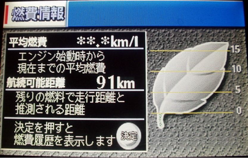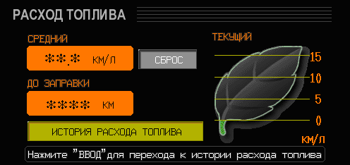 Сам листочек - это мгновенный расход топлива в литрах на один км. Чем он зеленее, тем расход меньше и наоборот. В переводе на более привычные нам цифры: 15 km\L = 6,6 литров на 100 км, а 5 km\L = 20 литров на 100 км.Верхняя цифра с лева от листочка - это усреднённый расход бензина, а цифра под ней - это то количество километров, на которое хватит горючки в баке при данном режиме езды (поэтому она пересчитывается часто, в зависимости от силы давления на газ). Далее при нажатии джойстика высвечивается: По сути аналогия первого экрана. На этом экране отображается суммарное время работы автомобиля, пройденные километры и средняя скорость. Данный экран показывает шкалу о необходимости заехать в пит-стоп, где произвести те или иные замены. При нажатии нижней правой кнопки высвечивается экран: Нижняя правая кнопка остается под вопросом – никаких видимых изменений при ее нажатии не происходит. Сообщение отредактировал Antibo - 15.12.2010, 6:16 |