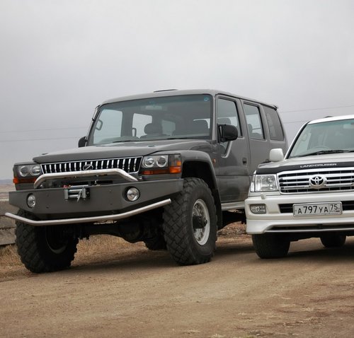 ЛЕГЕНДА СТЕПЕЙ Момент истины настал, когда после вояжа по запыленным сопкам мы встали рядом со сверкающим Land Cruiser 100. Культовый японский внедорожник смотрелся невинной игрушкой рядом с творением Вячеслава Золотухина из некогда закрытого города Краснокаменска. Вот тогда и пришло полное осознание масштаба этого супервнедорожника длиной 5,8 метров, шириной 2,3 метра и такой же высотой. Ведь по той легкости, с которой машина только что буквально порхала по склонам и камням, трудно представить, что в ее основе лежит шасси небезызвестного военного грузовика ГАЗ-66. Вячеслав давно знает хорошие автомобили, еще в 90-х годах занимался их перегоном с Дальнего Востока. В собственном распоряжении был не один японский внедорожник, избороздил на них много всего. И со временем захотелось гораздо большего, чем могли предложить стандартные заводские решения даже в классе тяжелых джипов. Тюнинговать? Нет, не устраивало. Хотелось, так сказать, концептуально иного уровня, нечто вроде Mega Cruiser, но под собственные представления о комфорте, вместимости, надежности, проходимости и так далее. Так вот дело подошло к необходимости самому строить свою машину, вольно используя достижения отечественного и японского автопрома. Фундаментом проекта стал ГАЗ-66. Конечно, не случайно, а очень осознанно. У этого советского «блокбастера», конечно, есть свои просчеты: никудышные двигатель и коробка, да и сама компоновка машины с тяжелой кабиной и мотором над передним мостом есть крайне неудачное решение в плане развесовки. Но у «шишиги» есть и свои замечательные стороны, особенно именно у военных образцов выпуска до 1975 года, когда машина делалась только для оборонки и действительно на совесть. К тому же, легкий армейский грузовик проектировался с расчетом его десантирования с воздуха. Из главных достоинств — прочная, но «гибкая» рама из 6-мм стали и крепкие мосты со свободными полуосями и эффективными самоблокировками дифференциалов. Из минусов для «гражданской» эксплуатации — постоянное зацепление передних колес, мост отключается только в раздатке. Но эта проблема при умении оказалась устранима. В общем, голое шасси ГАЗ-66, причем со снятым двигателем, КП и кабиной, и стало вдохновляющим началом для конструирования. Так сказать, скелет «в черновую» готов, причем с полным сохранением колесной базы. А вот сердцем и телом для будущего «кинг-конга» стали части… тоже от грузовиков, но теперь уже японских, причем среднетоннажных. Двигатель от пятитонника Hino — 6-цилиндровый дизель объемом 7,5 литра. Атмосферный, полностью чугунный, с рядной механической аппаратурой, с шестеренчатым приводом ГРМ — красавец! Коробка 6-ступенчатая от него же, а вот раздатка осталась родная от 66-го, но Вячеслав перебрал ее с заменой наших «квадратных» подшипников на импортные аналоги, после чего шум заметно снизился. Надо ли уточнять, что подгонка силовой части потребовала других креплений и переделки поперечин рамы? Кроме того, рама была «обрезана» по краям. Но важно отметить, что увесистый дизель из соображений правильного распределения нагрузки был смещен как можно дальше назад. В свою очередь это благоприятно отразилось на самом дизайне кузова, который по всем канонам классических джипов получился с «вынесенным» вперед мостом и коротким свесом. При этом сравнительно громоздкий двига