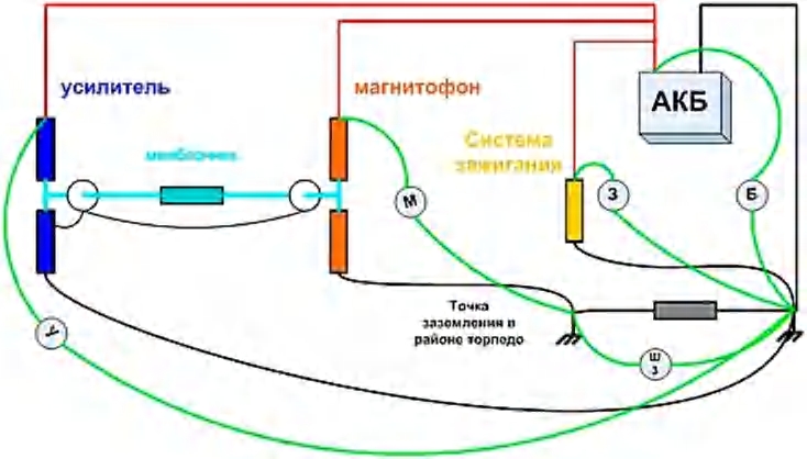 Устранение шума в Аудиосистеме Что надо делать, если Аудиосистема, которую вы установили, дает посторонний шум или помехи. 1. Отсоедините головное устройство от Аудиосистемы. Если шум прекратился — заземлите головное устройство в общую точку на корпусе, куда ЗАЗемляются остальные компоненты системы. 2. Если шум не исчез, и если компоненты заземлены в разных местах на корпусе автомобиля, то, пользуясь цифровым мультиметром (ЦММ), замерьте напряжения между отрицательным терминалом аккумулятора и точками ЗАЗемления каждого компонента. Если Вы обнаружили разницу в показаниях, то необходимо уравнять уровень сигнала между компонентами, ЗАЗемлить все компоненты в одном месте на корпусе, или найти другое место на кузове для «земли» компонента, напряжение которого отличается от других показаний. Уровень сигнала между компонентами должен быть одинаковым. Показания уровня сигнала между компонентами снимаются с экранов RCA кабелей во всех возможных комбинациях между компонентами Аудиосистемы. 3. Если же разницы в показаниях ЦММ нет, то причина шума, скорее всего в следующем: - RCA провода расположены в непосредственной близости к силовым проводам или RCA провода плохого качества. - Аустические провода проложены параллельно силовому кабелю или пересекают его под углом меньше 90 градусов; - Аустический провод имеет контакт с кузовом автомобиля; - Крпус усилителя не изолирован от кузова автомобиля; - Атенна плохо ЗАЗемлена и создает контур. |