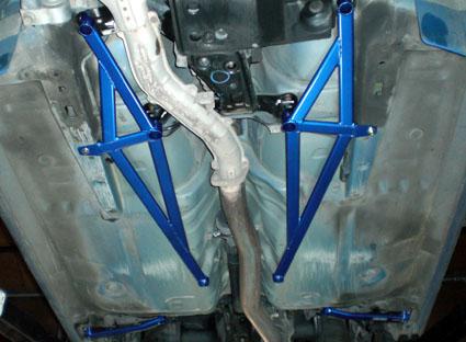 Так зачем же все эти распорки и растяжки кузова? Пожалуй начнем по порядку... Кузов автомобиля не цельно литой, а состоит из отдельных элементов. Какие-то элементы привариваются друг к другу, какие-то прикручиваются ... Как ни крути, но в тех местах, где они крепятся, у кузова "слабые места". При движении происходят микродеформации кузова, из-за чего со временем автомобиль начинает терять устойчивость на дороге. При движении по прямой это малозаметно, так что для драг рейсинга это не актуально, а вот при перестроении на больших скоростях (кольце) машина плохо управляется. Не хочу говорить о плохом, но машину может повести настолько сильно, что Вы можете потерять управление над машиной и подвергнуть свою жизнь опасности. Именно поэтому первое, что мы видим на машине - это распорка передних стоек. Она ограничивает деформацию кузова во время кручения. Именно этот показатель очень важен, когда речь идет о точном и уверенном перестроении и прохождении связок поворотов на высоких скоростях. При инсталляции на передние стойки распорка должна свободно надеться на шпильки верхних опор стоек (на стаканы). Для этого необходимо открутить все видимые гайки на стакане, но соблюдая определенные правила. Прежде всего, необходимо поставить автомобиль на ровной площадке без уклонов. Если машина стоит ровно и распорка предназначена именно под Ваш автомобиль, то все оденется без особого геморроя, работы на 5-10 минут. Если же отверстия не надеваются на шпильки и несовпадение всего 1-2 мм, то необходимо потянуть кузов автомобиля в нужную сторону. Если распорка все-таки не подходит, то тут два варианта: либо ваш автомобиль бывал в аварии, либо эта распорка не для Вашего авто Одеваем, закручиваем все гайки, любуемся и едем тестировать на трассе. Распорки бывают как двухточечные, так и с дополнительными точками крепления: Распорки ставятся не только на передние и задние стойки, но и много еще куда. Смотрим на картинку ниже: Ниже представлено несколько анимированных изображений, которые наглядно показывают, как ведет себя автомобиль в тех или иных условиях, с распорками и без них : До В стандартной машине нагрузки с передних колес передаются на стаканы стоек, те в свою очередь изгибаются вверх и внутрь. В то же время нагрузка передается на опоры нижнего рычага подвески и заставляет его отклоняться наружу. Это приводит к изменению развала передних колес и к уменьшению пятна контакта шины с дорожным покрытием, таким образом, ухудшаются торможение и управляемость. После Установка верхних и нижних распорок позволяет увеличить жесткость кузова, исключая перемещения стаканов стоек и нижних рычагов. При совместной установке нижней и верхней распорок значительно повышается управляемость машины. Как ведет себя машина при повороте: До Когда стандартный автомобиль входит в поворот, его вес передается на внешнее переднее колесо. При этом происходит уменьшение сцепления шин с дорожным полотном и уход с траектории поворота. После: С верхними и нижними распорками геометрия кузова изменяется незначительно, и, как следствие, улучшается контроль над автомобилем при прохождении поворотов. Распорки в крылья: При прохождении поворотов также возникают усилия, изгибающие стаканы стоек вверх-назад, при этом происходит изменение угола продольного наклона оси поворота колес