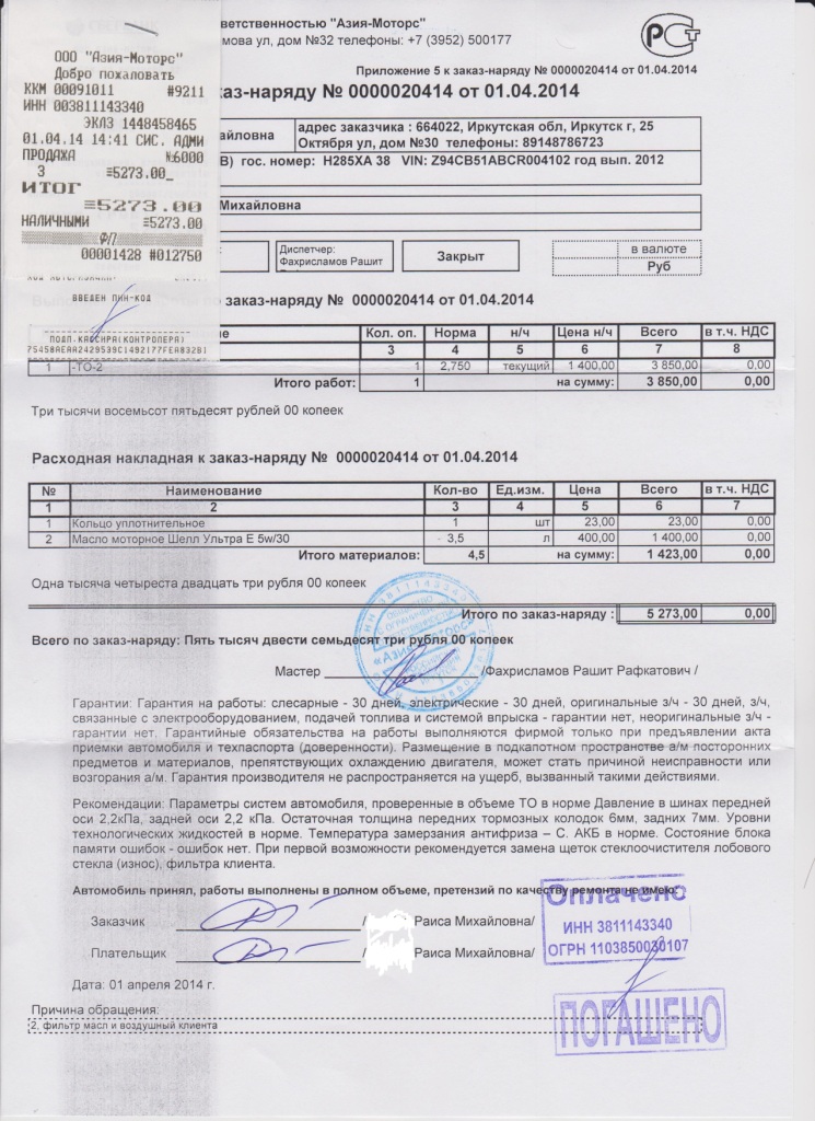 Итак про ТО-2, да и вообще про то, как то проходит в цивилизации. На каждый авто проданный у официального дилера в компакте ключей и документов идет инструкция по эксплуатации (на русском языке) и сервисная книжка, где отмечаются предпродажная подготовка, плановые ТО и прочие болячки выявленные в процессе эксплуатации. Эдакая "история болезни", которая заведена на каждого из нас в поликлиниках по месту жительства. Дилеры пытаются убедить, что только их сервисные центры могут проводить ТО, предоставлять запчасти, делать записи в сервисной книжке. Свистят!!! Закон о защите прав потребителей никто не отменял, поэтому если проводить обслуживание в сервисных центрах имеющих все сертификаты, оформляющих предусмотренные законом "Заказ-наряды" (вложение) и имеющие круглые печати - то только суд может решить, что обслуживание проводилось не в соответствии с регламентом. При наличии всех документов, сертификатов и чеков на запчасти (покупаю на "экзисте") дилеру будет очень сложно доказать, что это "мы поломали", а не заводской брак. Так что, Магаданцы, если берете к примеру Киа Рио с гарантийным сроком 5 лет, проводите плановое ТО, к примеру, на СТО "Машиностроитель" и сохраняете все чеки, то гарантию у вас отнять никто не сможет. Факт! Отвлекся. То-2 проводится на 30.000 или через 2 года после продажи авто. Запчасти, как уже сказал, брал на Exist.ru, это получается примерно в 3 раза дешевле чем у ОД. Комплект фильтр салона, воздушный и масляный фильтр, прокладка под сливную пробку обошлись в 850 руб. с учетом доставки. Все детали - оригинальные, не аналог. Но все равно стоимость ТО кусается, более 5.000 рублей. Связано это с тем, что проводят полную диагностику подвески, двигателя, трансмиссии, кузова, тормозной и рулевой системы, в общем все проверяют по полной программе. Что мы имеем: остаток передних колодок 6 мм (новые 11), задних 7 мм (новые тоже 11), тормозная жидкость- норма, ОЖ до -40 (норма), электролит - норма, вся подвеска в порядке, сальники все целые, течей нет, даже ни одна лампочка не перегорела. Жмите тапку дальше! Скукотища... Следует отметить, что автомобиль ночует на улице, этой зимой мама решила даже в лютые морозы не выходить и не прогревать его (даже в -40, мол и так заводится!). Живет хозяйка за городом и от асфальтированного шоссе до ее дома имеется грунтовка протяженностью 5 км. (ничем не отличается от того, что было в сторону Армани лет 5 назад - скажу так, вдруг там асфальт уже везде?) Так что каждый выезд -это примерно 10% от общего пробега проходит по средне- убитой грунтовой дороге. Из претензий - перегорела одна нить обогрева заднего стекла. На месте дефект не выявили, поэтому надо сделать фото и видео когда стекло запотевшее и дефект будет явно виден. Стекло поменяют по гарантии целиком, прецеденты уже были. Еще слегонца шоркнуты передний и задний бамперы - издержки эксплуатации. Причем оба косяка мои Все... Едем дальше. Еще! Т.к. прошли ТО у ОД, то продлили программу помощи на дорогах на один год. Это если автомобиль сломается, у него кончится бензин в радиусе 80 км. от любого дилерского центра, то бензин доставят (возьмут только его стоимость) либо сам автомобиль эвакуируют. Бесплатно. Спасибо! — Рамзес